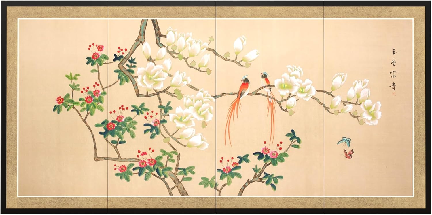 The brilliant red blossoms of the plum tree have been a richly symbolic subject of Chinese art and poetry for over a thousand years. Master artisans working in this tradition have painted and gilded these screens by hand, and no two are exactly alike. Each comes mounted on four panels, bordered with silk brocade, and set in a lacquered wooden frame. Ornamental hangers are included for wall mounting, but this painting can also be folded and placed on a table or floor to create an artful privacy screen.